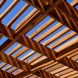 wooden pergola in the sun with blue sky