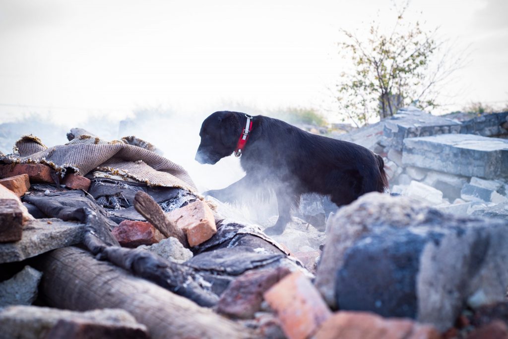 I cani hanno un olfatto sviluppatissimo e un eccellente udito. Questo permette loro di sentire il pericolo anche a distanze enormi. È il caso anche degli incendi. I cani sentono la presenza del fuoco e dei fumi tossici e spesso cercano di avvertire il proprio umano. Esistono infatti miriadi di storie in cui i nostri amici a quattro zampe si prodigano lanciandoci segnali, come ringhiare o leccarsi le labbra, per farci capire l’imminenza del pericolo. Il cane per eccellenza che non ha paura del fuoco è il dalmata (scopri un articolo tutto dedicato a lui qui). Non per niente, questo quadrupede a macchiette bianche e nere è il simbolo dei Vigili del Fuoco. Ma come si comportano le squadre cinofile in presenza di incendi? Se si tratta di incendi estesi o di particolare intensità, non effettuano ricerche utilizzando i cani, in quanto sarebbe necessario proteggere, oltre al corpo dell’animale, anche le sue vie aeree per evitare intossicazioni. Viene meno quindi il maggiore punto di forza di queste creature per la ricerca: l’olfatto. I cani vengono in ogni caso addestrati all’indifferenza nei confronti di situazioni in cui siano presenti fuoco e fumo, in quantità non eccessive. Si possono quindi effettuare ricerche anche in quei casi in cui a seguito di crolli si sia sviluppato un incendio. I cani vengono impiegati anche nel caso di sospetti incendi dolosi, per trovare indizi sulle sostanze chimiche rinvenute sulla scena del crimine e utilizzate per appiccare l’incendio.